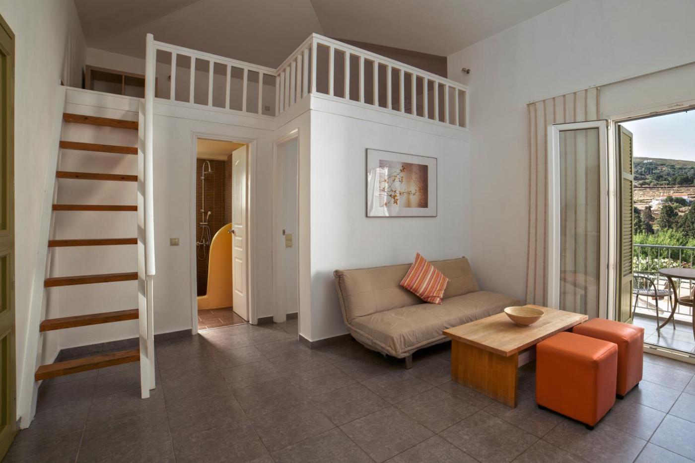 Family Suite with Garden and Pool View. This spacious, split-level suite consists of an air-conditioned bedroom with TV and an air-conditioned living room with kitchenette, TV and a balcony. It includes a furnished veranda overlooking the Aegean Sea and a spacious bathroom with hydromassage jet shower. Free Wi-Fi is available. ;