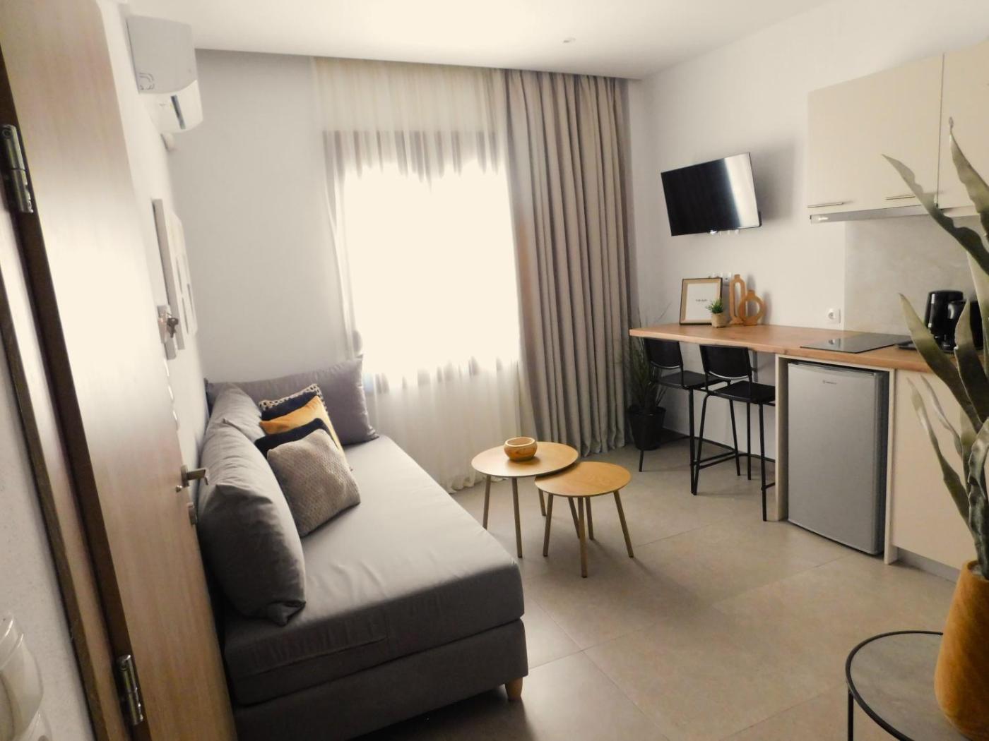 One-Bedroom Apartment. Boasting a private entrance, this air-conditioned apartment comes with 1 living room, 1 separate bedroom and 1 bathroom with a walk-in shower and a hairdryer. Guests can make meals in the kitchenette that features a stovetop, a refrigerator, kitchenware and a tea and coffee maker. This apartment has a washing machine, flat-screen TV with cable channels, city views, as well as chocolate for guests. The unit has 3 beds. ;