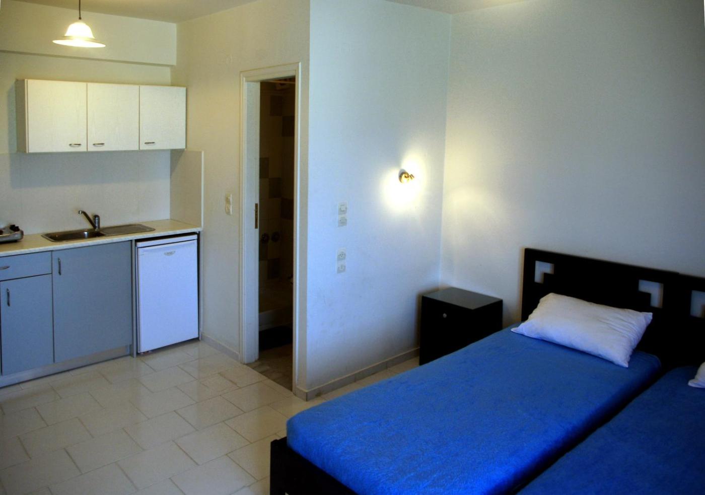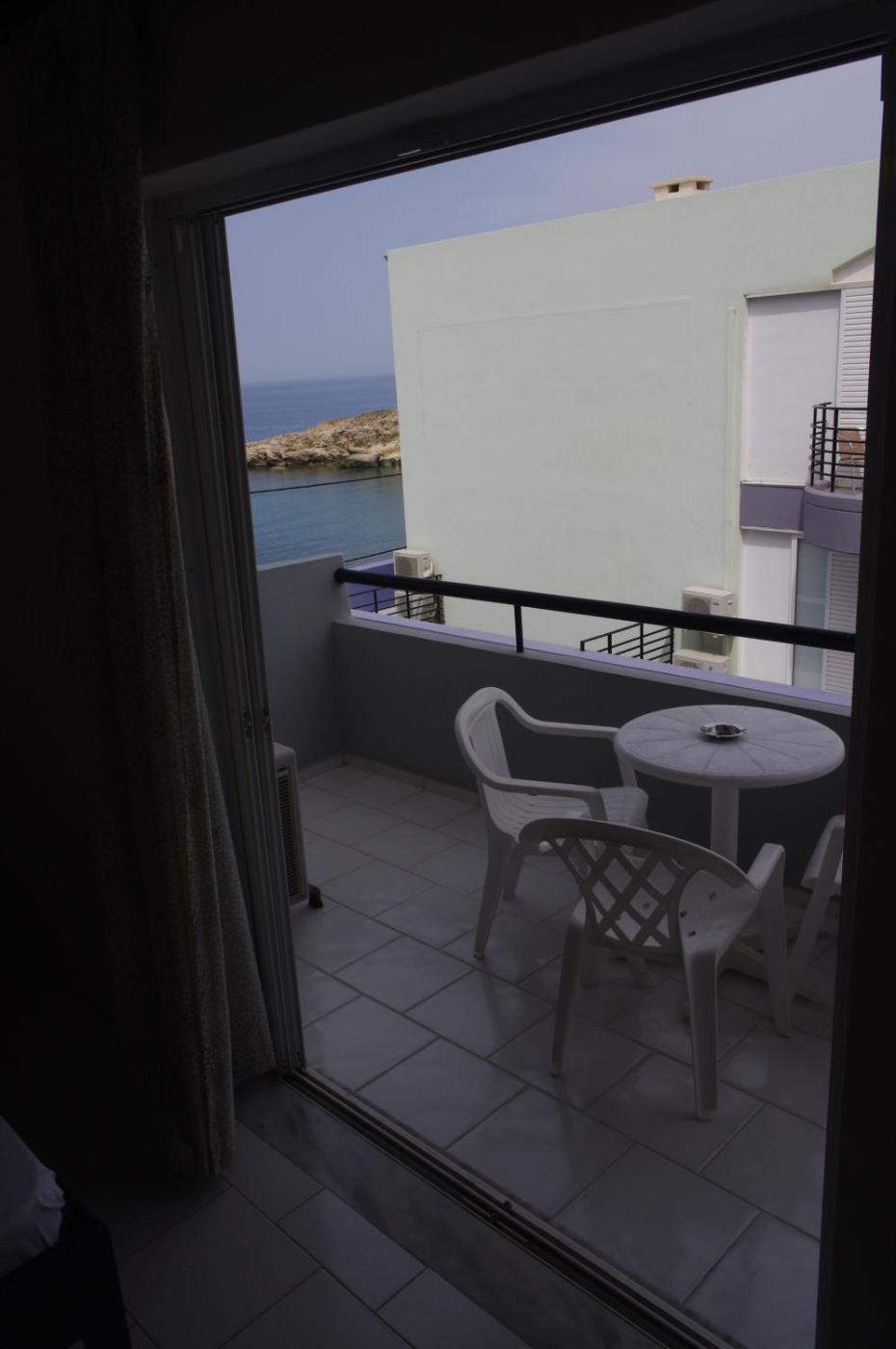 Studio with Side Sea View (3 Adults). Opening to a balcony, this spacious studio overlooks the Cretan Sea or the back, flowered courtyard. It has a kitchenette with a mini fridge, cooking hobs and dining table. It offers: - air conditioning - free Wi-Fi - satellite TV. ;