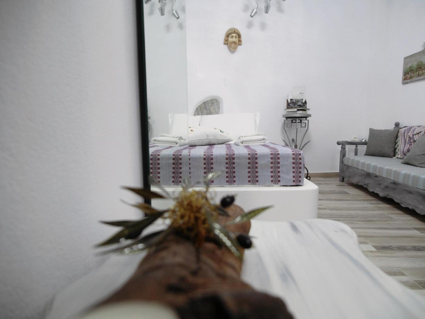 Deluxe King Suite (Ariadne & Dionysus Love Suite). Fitted with a tilegranite rustic floor, this air-conditioned suite has a dining area, a well-equipped kitchenette and a marble cement bathroom. Facilities include a flat screen TV and organic toiletries. ;