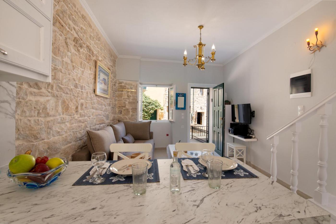 One-Bedroom House - Split Level. Opening to a balcony with Ionian Sea views, this air-conditioned and split-level, 1-bedroom house is fitted with a four-poster bed and brightly painted walls. It includes: -a living room with flat-screen TV -a fully equipped kitchen with dining table and oven with hobs -a bathroom with a shower and hairdryer.