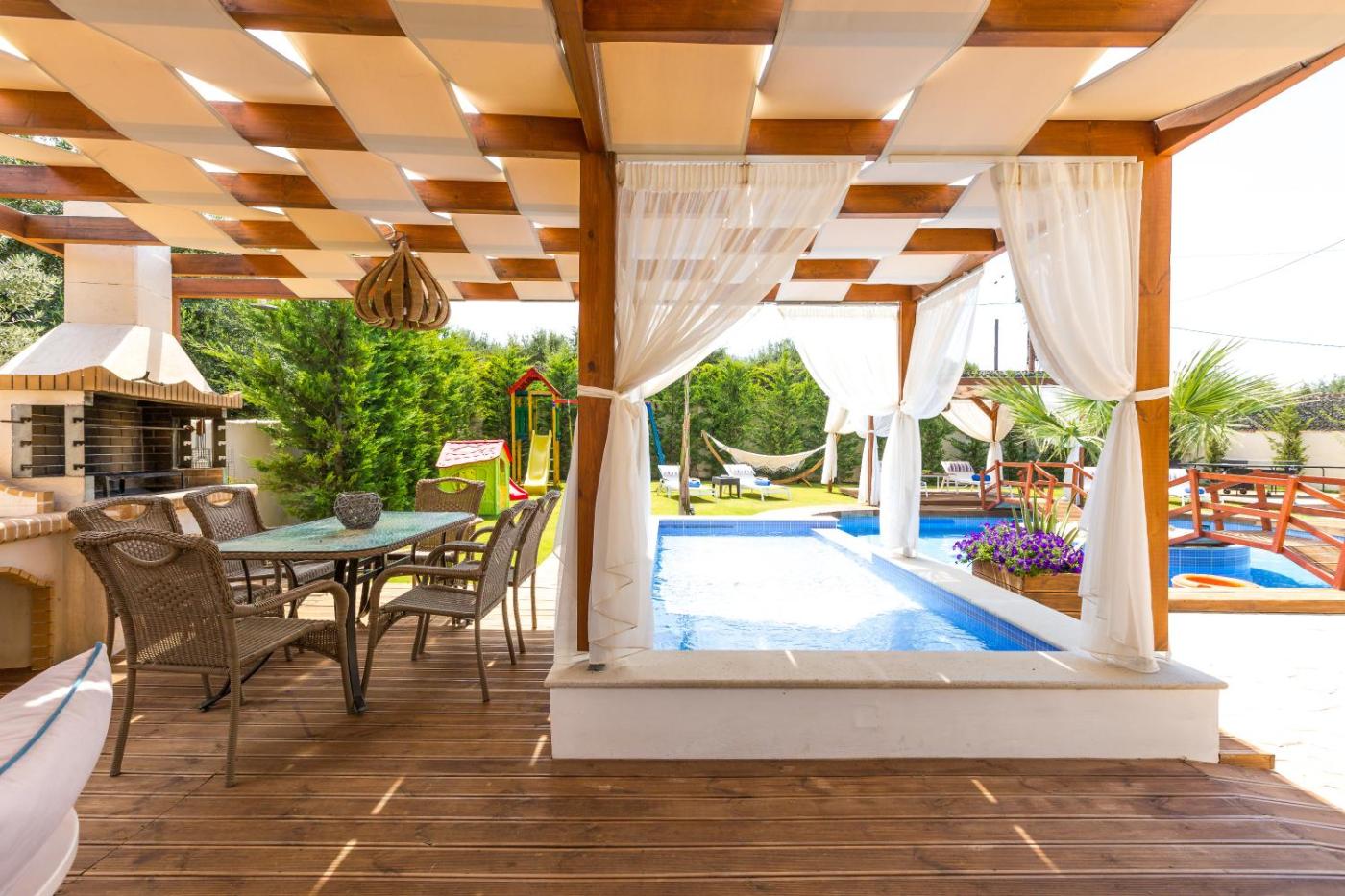 For guests with children, Eva & Dimitrios Villas, Captivating Oasis with Pools & BBQ, By ThinkVilla features kids pool, outdoor play equipment and a baby safety gate. If you would like to discover the area, cycling and walking tours are possible in the surroundings and the accommodation can arrange a car rental service.