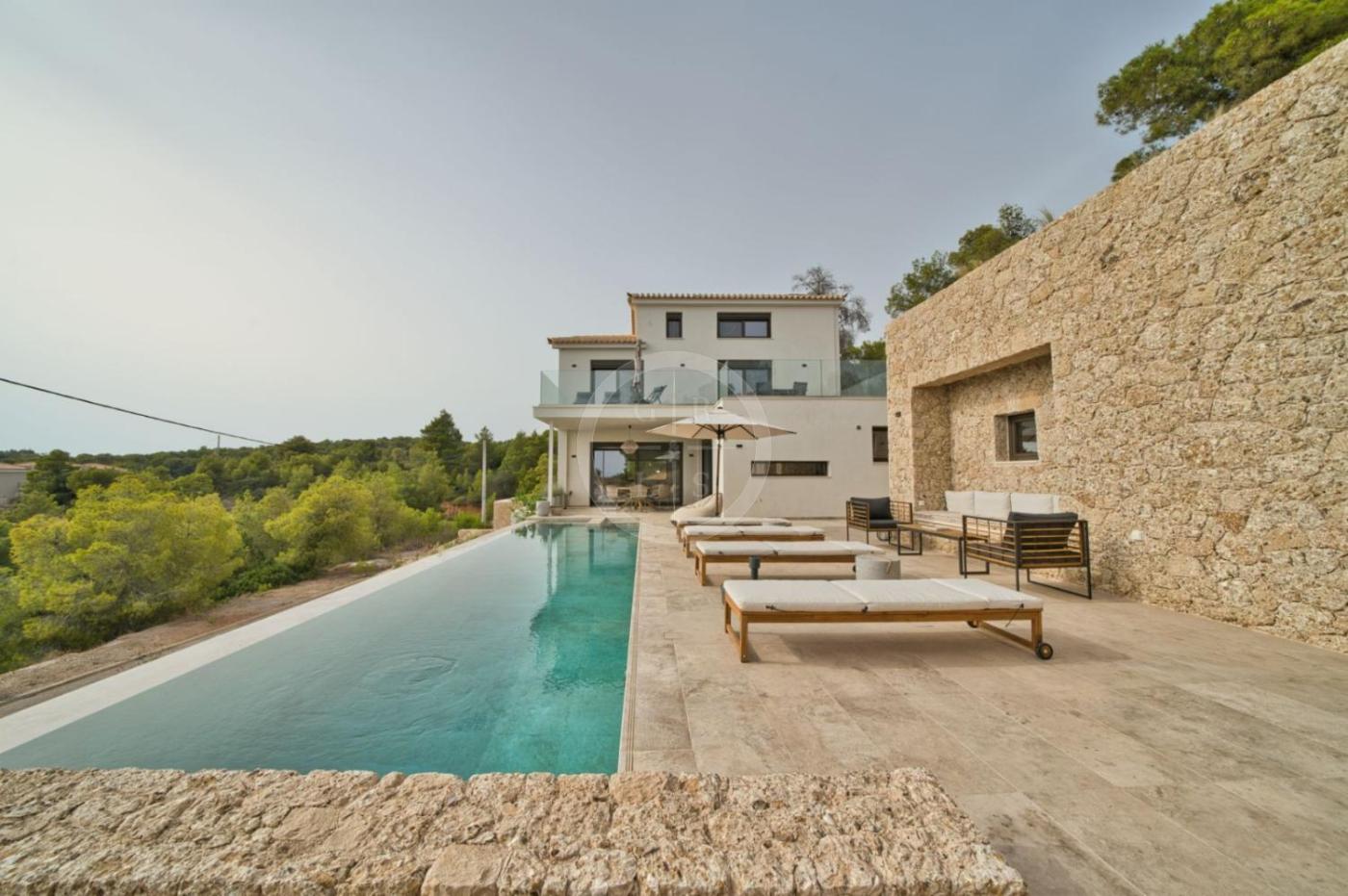 The spacious villa is equipped with 5 bedrooms, 5 bathrooms, bed linen, towels, a flat-screen TV, a dining area, a fully equipped kitchen, and a terrace with sea views. There is also a seating area and a fireplace.