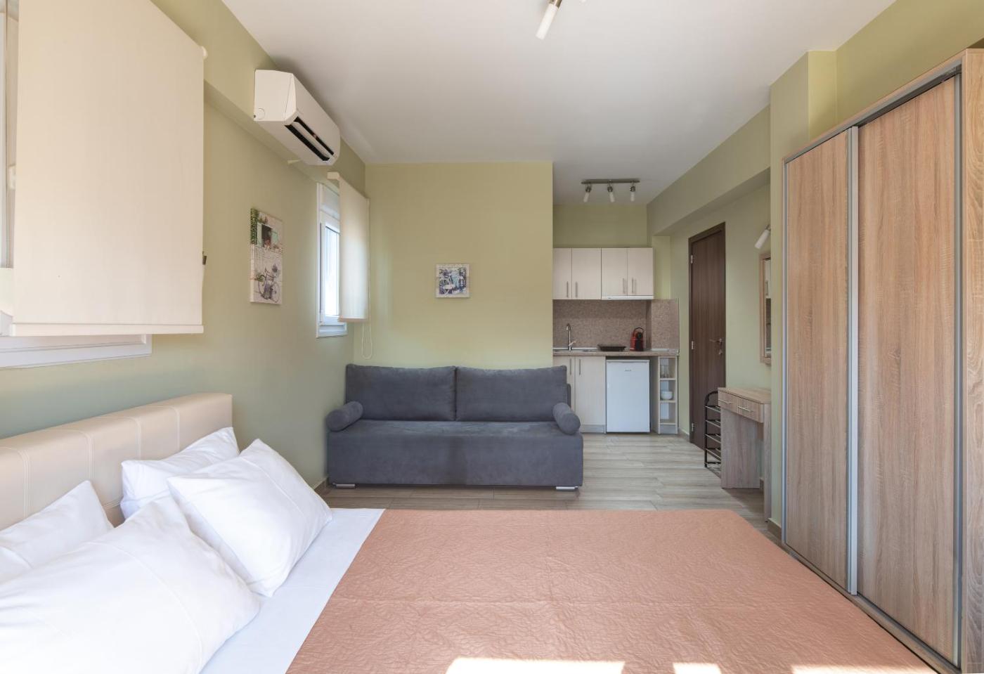 King Studio with Sofa Bed. Meals can be prepared in the well-fitted kitchenette, which is equipped with a stovetop, a refrigerator, kitchenware and a tea and coffee maker. The studio provides air conditioning, soundproof walls, a terrace with city views as well as a private bathroom featuring a shower. The unit offers 2 beds. ;